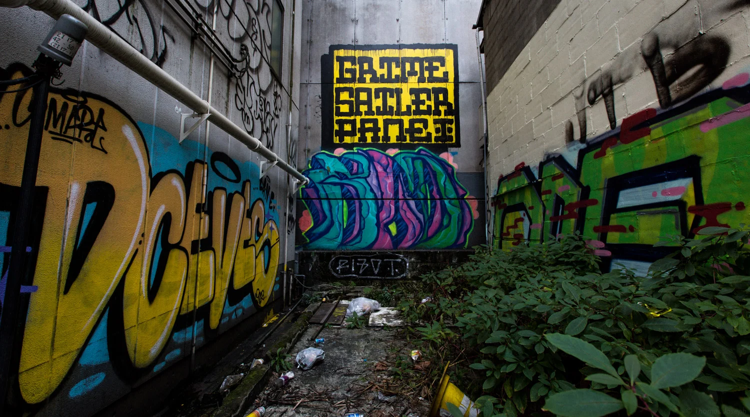 Between buildings near Shibuya, the trendy part of town.